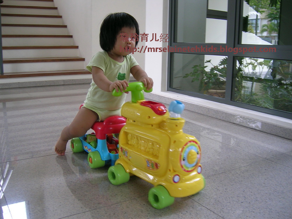 孩子们十个月便自己爬上去坐了,儿子先带头,还是男孩比较喜欢车子。这ABC Train可以学习颜色,ABC, 和一些字词,孩子们可以边玩边学习。1岁至2 岁这时间他们玩得最多,也爱骑在车子上走动。两岁后比较少玩了,儿子开始爱骑三轮车,可能有其他选择了。