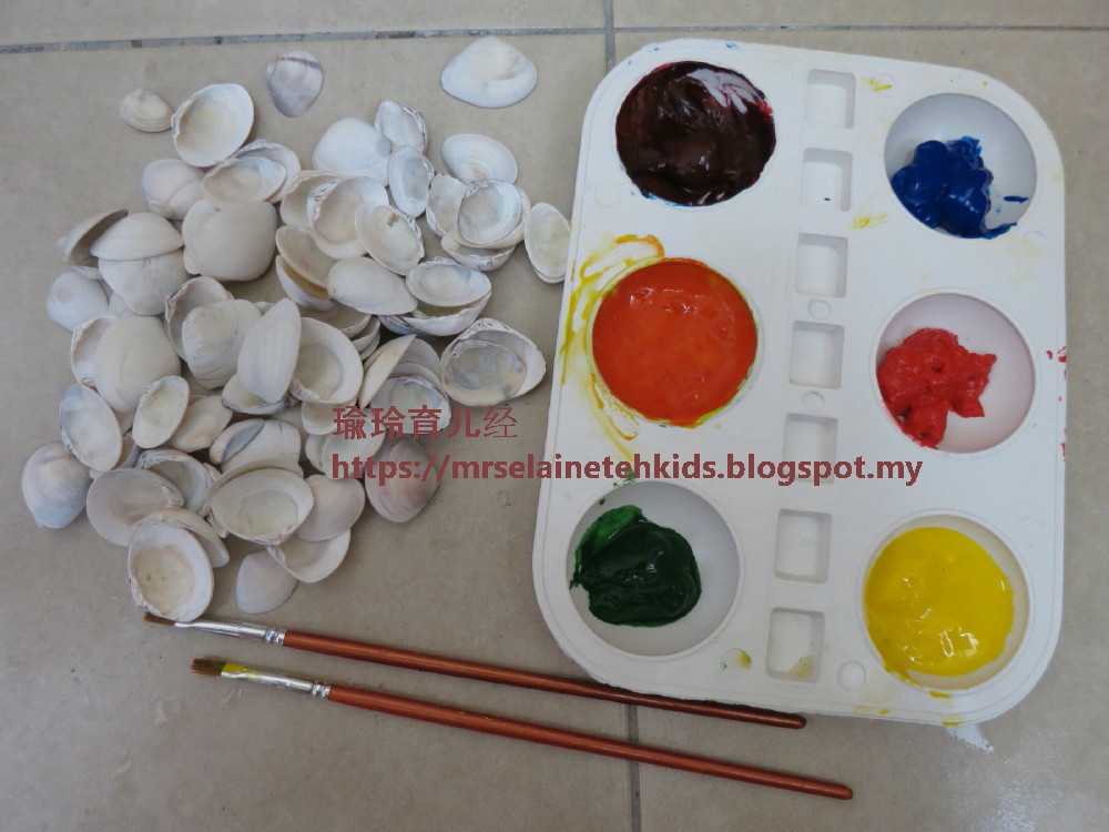 儿子偏爱蓝色,都把贝壳涂上蓝色。一直到蓝色涂完了后,他把原本的黄色调去青色了,他说他要涂上自己调的青色。我问他,已经有青色了,他说他的青色比较美。我也没有阻止他,让他们自己发挥好了。
